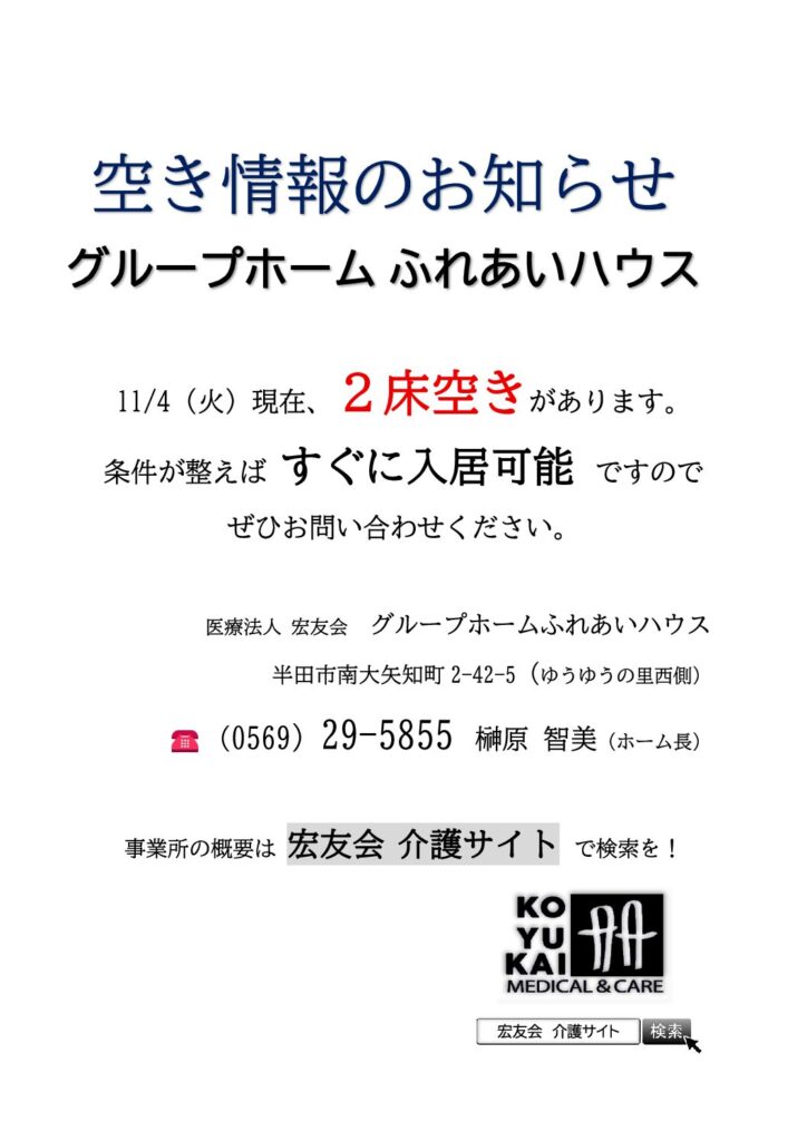 今年に入り入退所の動きが多く、11/5(水)現在、2部屋空きがあります。数件お問合せをいただいていますが、すぐに入居できる方を優先しますので、お早めにご相談ください。